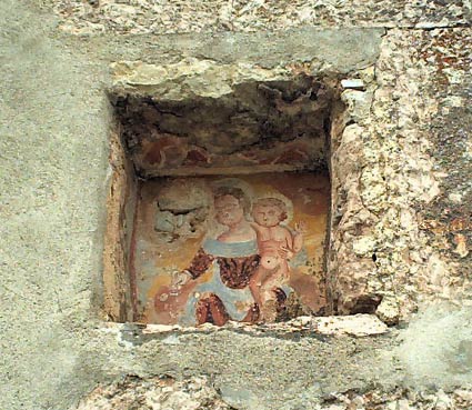 Intanto analizziamo nei dettagli l’edicola di contrada Campe: è del 1871 ed è murata sulla facciata di un’abitazione e dedicata alla Madonna con il Bambino. Reca l’iscrizione: INDULGENZA DI 40 GIORNI A CHI DICE AVE MARIA; sulla base dell’edicola, invece, un’altra epigrafe: A.M.R. VERGINE PER M.D. M.T. E.F. A 1871; probabilmente i committenti o gli oblatori.